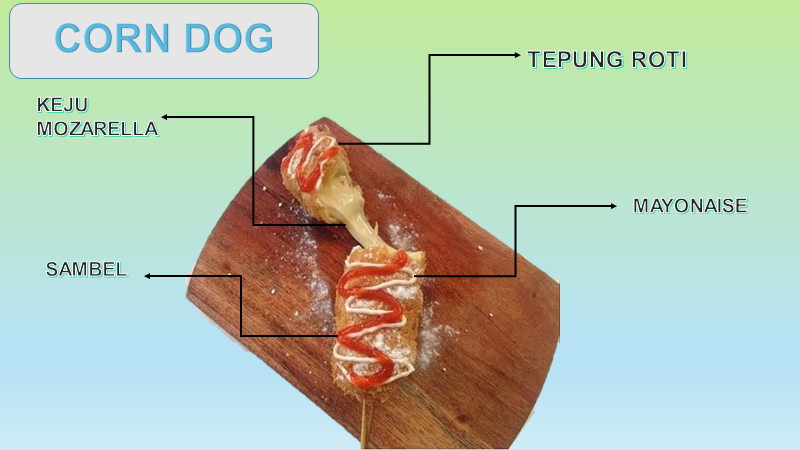 Corn dog merupakan makanan kekinian yang lagi hitz di kota makassar, harganya murah, ramah dikantong dan mengenyangkan. Bahan dasar dari corndog kami yaitu keju mozzarella & sosis yang dibaluri tepung terigu, tepung maizena, dan tepung roti. Bagi yang penasaran dengan makanan kekinian ini segera pesan di kami dijamin ketagihan!!!